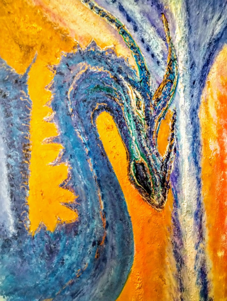 huile sur toile, détail de « Les Gardiens de la Source », 2,00m x 2,00m, septembre 2021, Le Puy-en-Velay