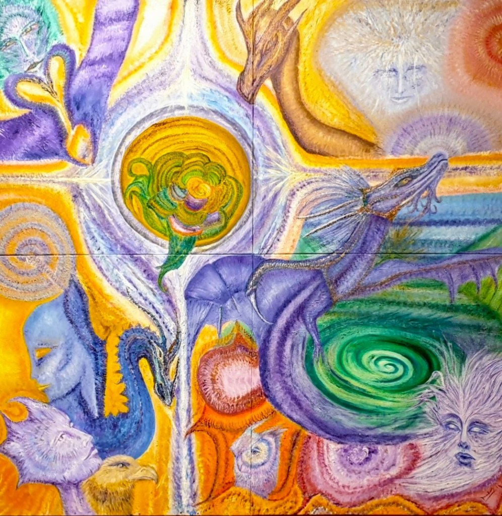 Cette huile sur toile peinte en septembre 2021 est un grand format de 4m2 divisé en plusieurs sections suggérant une grille ou un damier cosmique. Une Rose d’Or vibrante et complexe occupe le centre. Elle irradie une lumière jaune orangée. Autour d’elle, des formes et des visages éthérés émergent de tourbillons de couleurs évoquant les quatre éléments et diverses entités. La palette est riche, allant des violets et bleus profonds aux jaunes éclatants et verts lumineux. Elle suggère un mouvement énergétique intense et une transformation. Des créatures ressemblant à des dragons ou des serpents entrelacés, des figures humaines ou semi humaines aux expressions énigmatiques, et des vortex énergétiques animent la toile, convergeant vers, ou émanant de la Rose centrale.