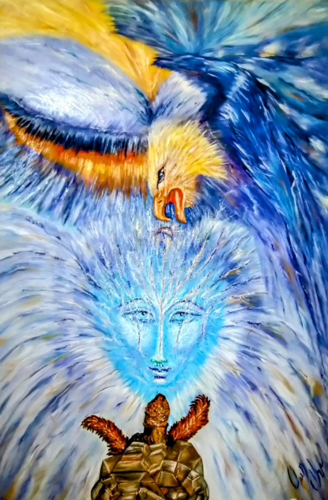 L’aspect presque mystique qui se dégage de cette toile se manifeste par une ambiance éthérée, intemporelle, où le tangible et l’intangible se rencontrent. Les éléments du tableau, tels que la tortue, le visage, l’aigle, ne sont pas ancrés dans une réalité physique ordinaire ; ils existent dans un espace semblant appartenir à un plan supérieur, à un rêve éveillé ou à une dimension archétypale. Cette mystique est accentuée par la palette de couleurs, dominée par les bleus profonds et les blancs lumineux, évoquant le ciel infini, les eaux primordiales et la pureté spirituelle.