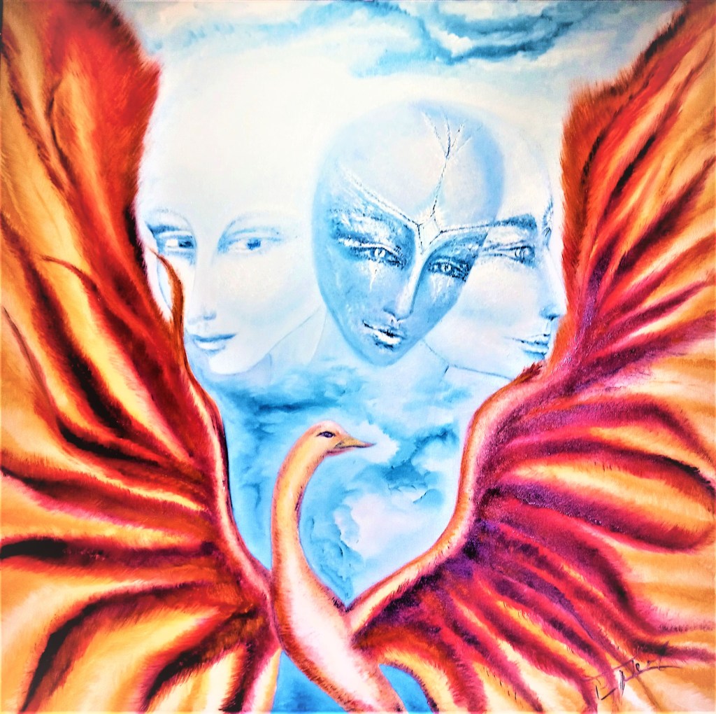 La toile Le devisement de Phénix (huile sur toile, 100 cm x 100 cm) représente plus qu’une simple manifestation de mon expérience personnelle. Née de l’épreuve d’un cancer du « pan-créa » opéré en juin 2019 et d’une première EMI vécue à l’âge de 4 ans puis durant les suites opératoires de cette opération, cette œuvre propose une fusion de l’intime et de l’universel. Elle témoigne d’un dialogue sacré, d’une transmission de sagesse et d’une compréhension holistique transcendant les barrières du monde physique et profondément ancrée dans les saveurs de mon enfance silencieuse. Car l' »infans » est « celui qui ne parle pas ». Mais perçoit. Perce pour Voir. Tel le Cœur pur de « Perce-val ». Celui qui voit au-delà du voile.