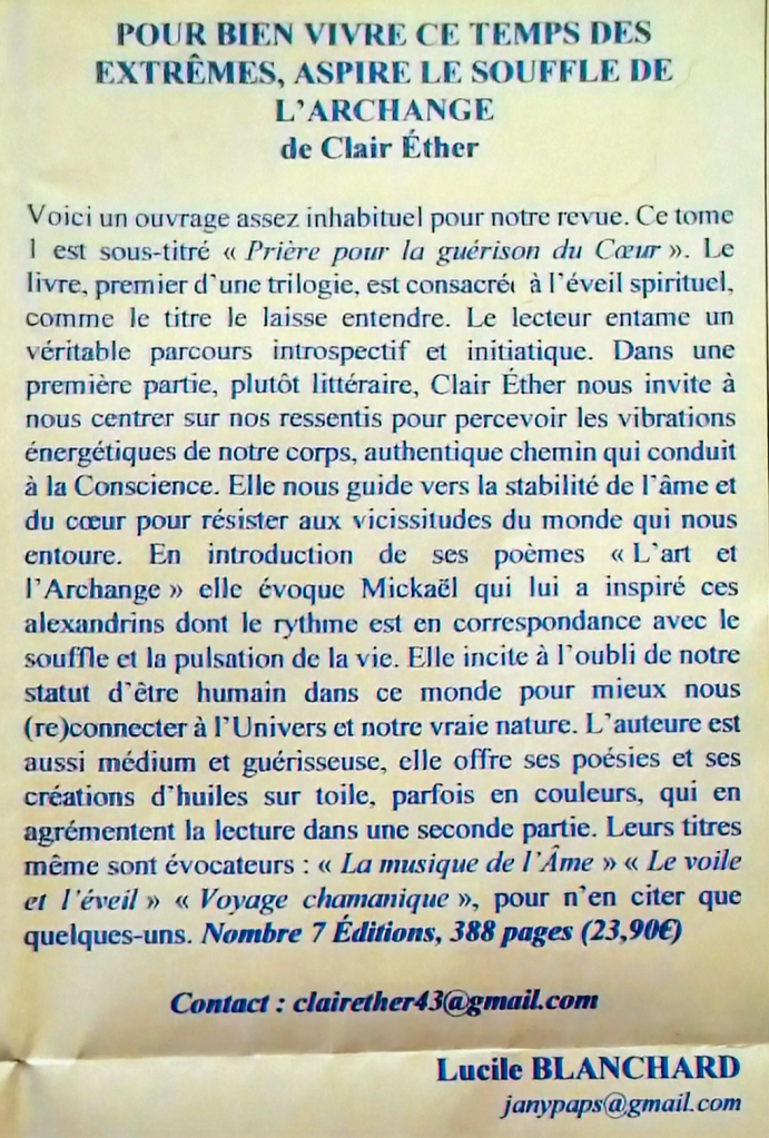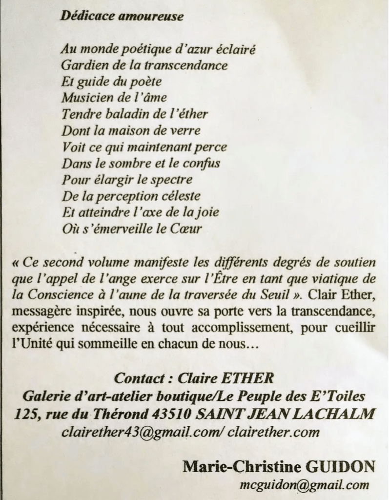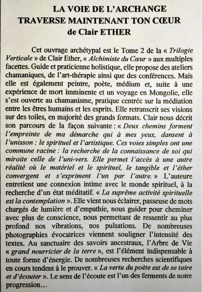 Clair Ether a été chargée de cours en anthropologie du corps et en français langue étrangère (FLE) à l’Université de la Sorbonne Nouvelle Paris III et à l’Alliance Française de Paris, puis professeure de lettres auprès d’adultes et d’adolescents pendant 33 ans. Parallèlement, ses dons de poétesse et de peintre, de médium et de guérisseuse se sont affinés.