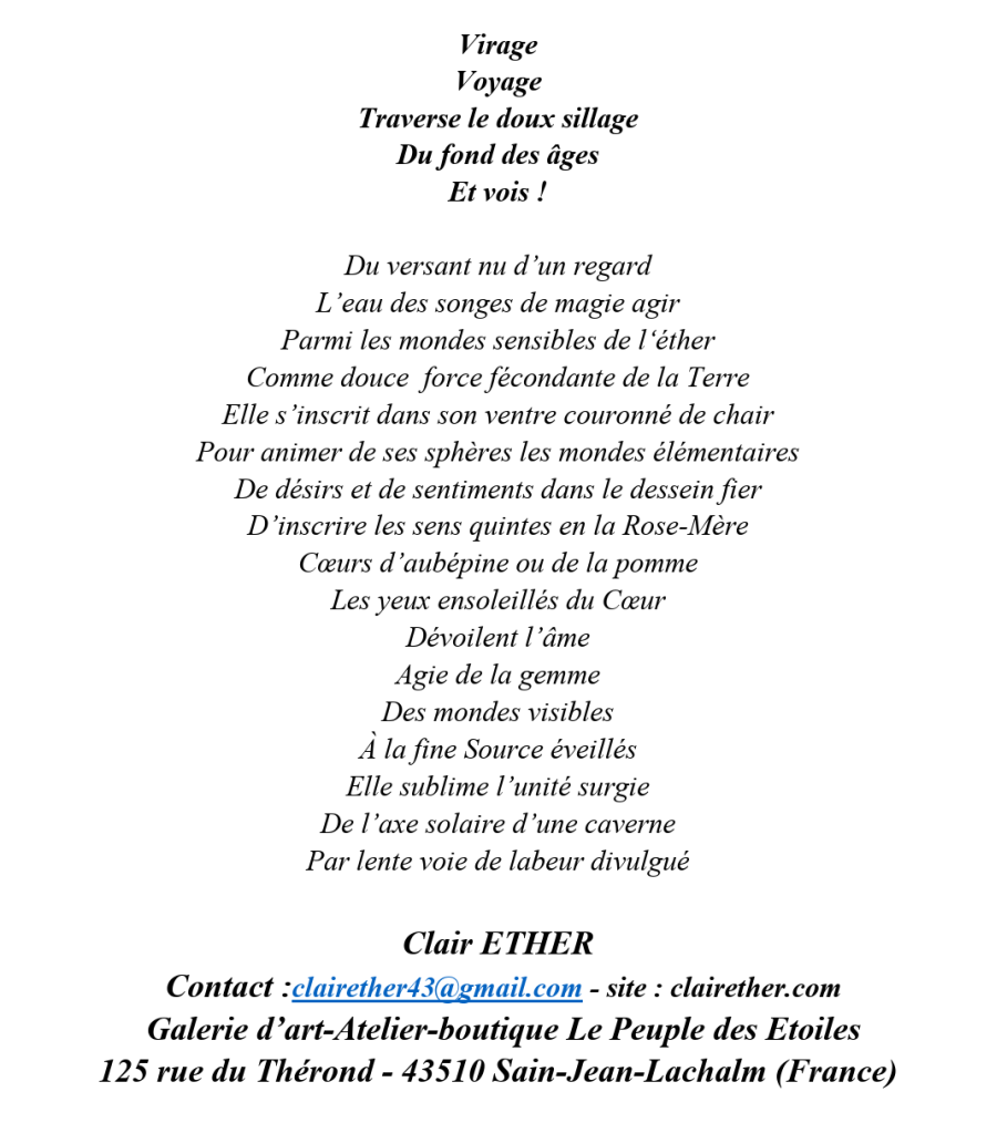 Le poète est ici dépeint comme un pont entre le ciel et la terre, le « dense uni au germe appelle le Chemin ». Il est l’incarnation de la « rose » qui, bien étant une fleur, contient la mémoire du « tout premier jardin ». La Rose est l’âme-pensante de l’univers, sa Mémoire et son Devenir. Le poète incarne et manifeste la « vivante mémoire » de l’origine. Il parle la « fine langue éclairée des astres », c’est-à-dire le langage symbolique de l’univers, qui n’est pas fait de mots, mais de fréquences et de couleurs, d’émotions et de vibrants mouvements. Il est ainsi le messager d’un « Royaume pluriel en ton cœur déposé », invitant chaque lecteur à se reconnecter à son propre potentiel divin. C’est une référence à l’Âme du Monde (l’anima Mundi dont nous parle Platon) et à son impact sur l’Âme des Jours de chacun.